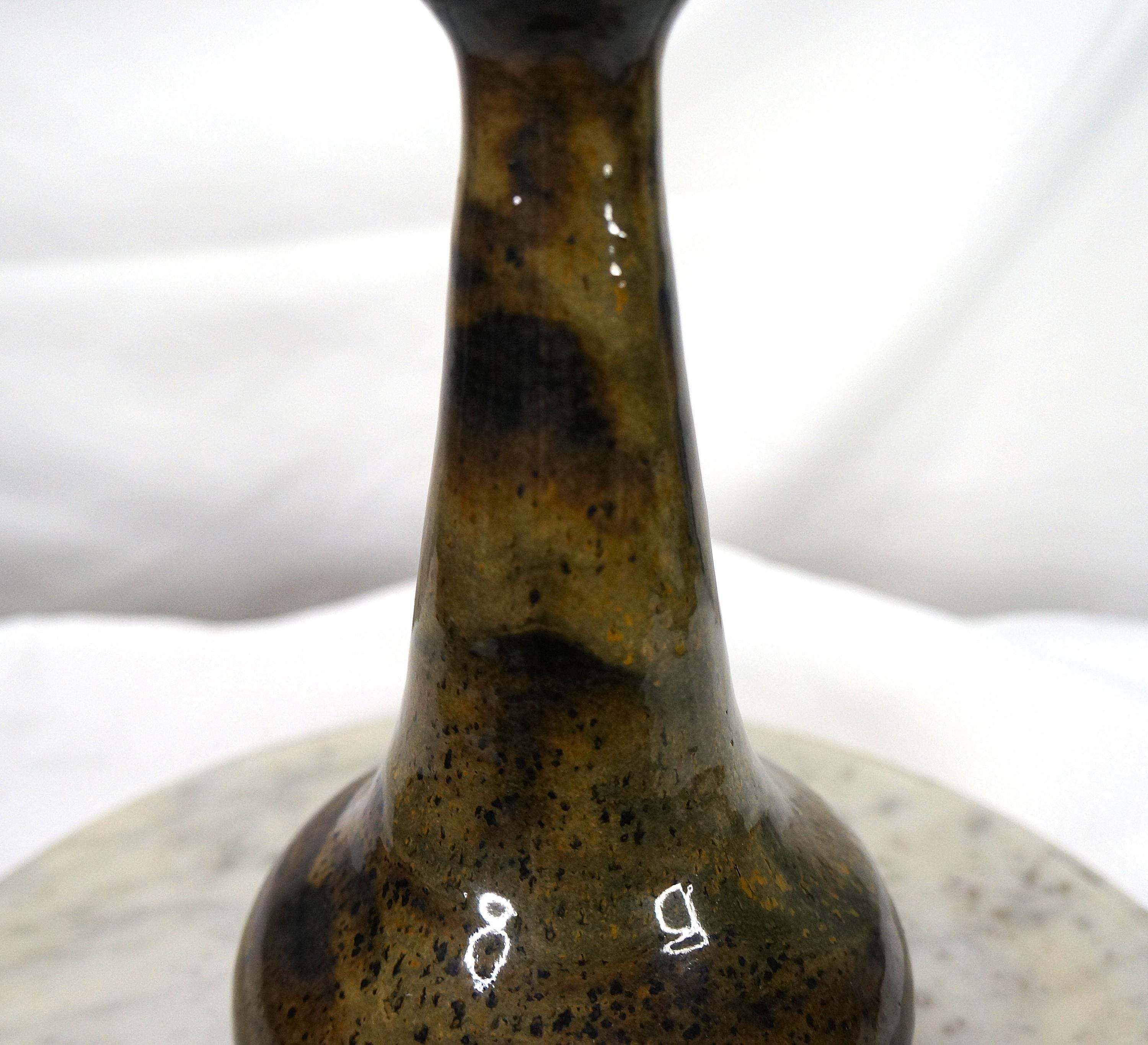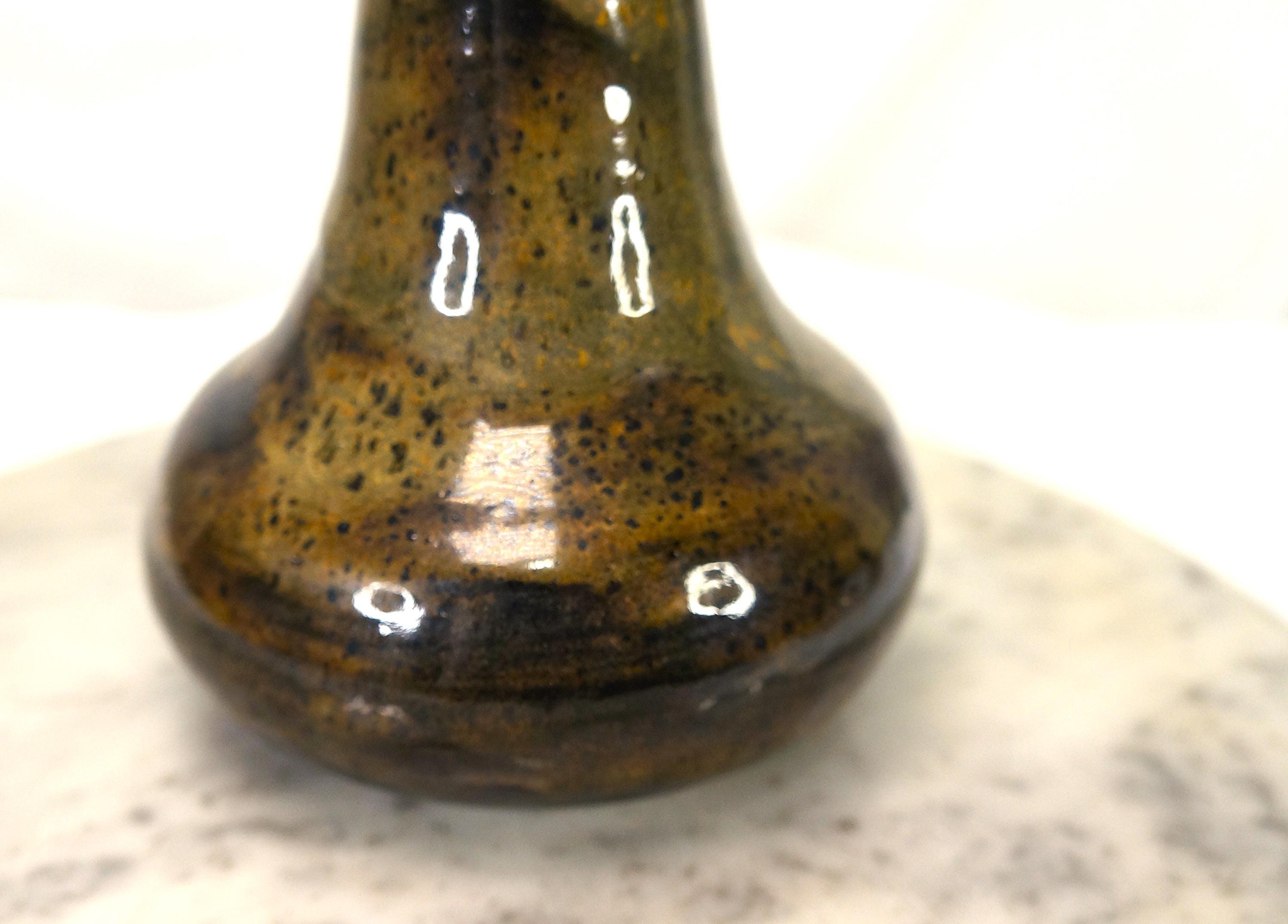 Finish: Layered reduction-fired glaze in brown, amber, and olive tones with subtle speckling and pooling