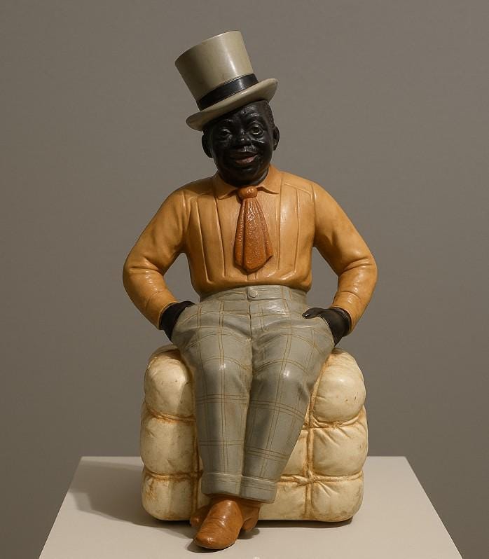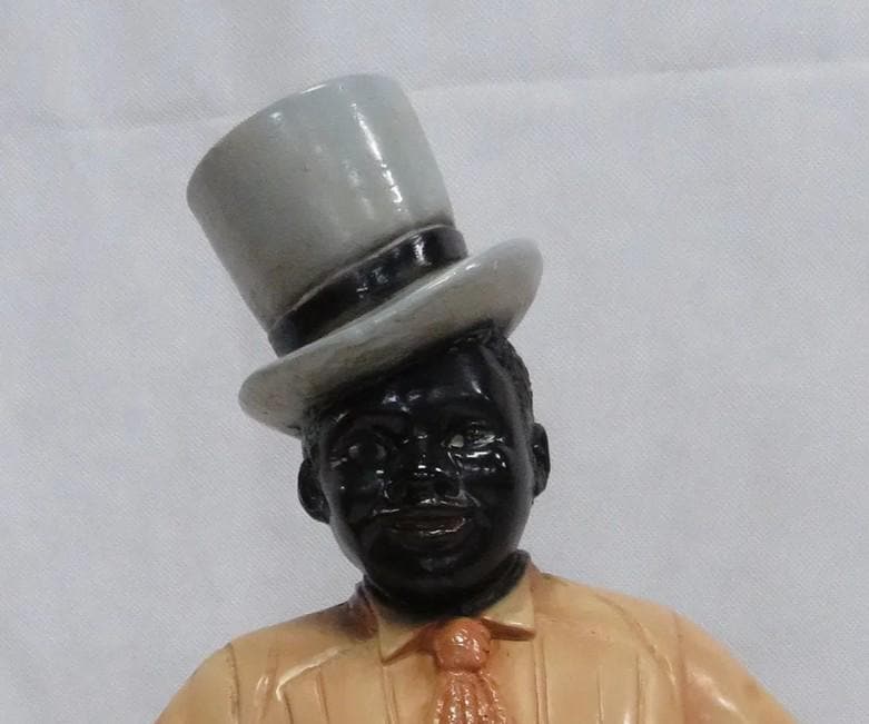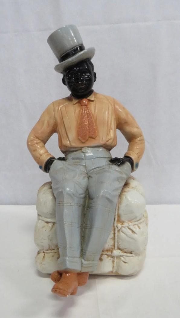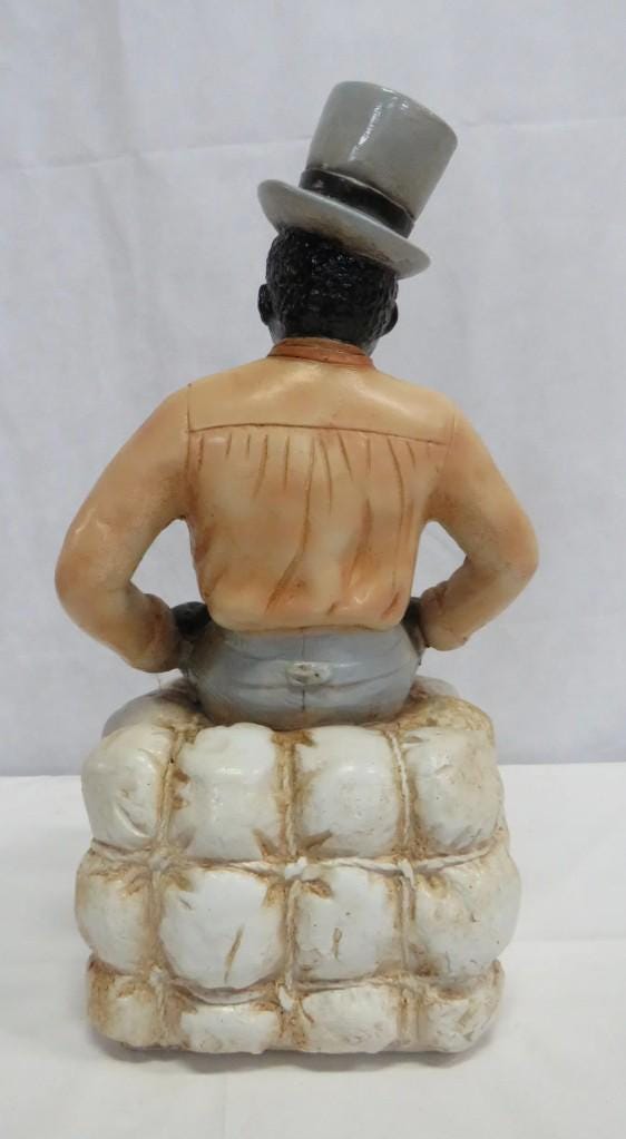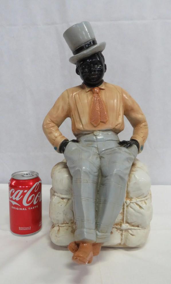 Large mid-century American chalkware/composition figure depicting a caricatured Black “dandy” figure seated on cotton bales.